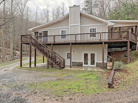 Re-modeled craftsman style home with a seasonal Mountain View. This property welcomes you home with the inviting front porch. It features an updated kitchen, large dining space that is open to the great room a stone fireplace with gas logs, the master suite on the main level with his and hers closets, an additional bedroom and full bathroom with laundry perfect for one level living. The terrace level features a recreation room, a bonus room, 2 bedrooms and a full bathroom. The exterior of the home showcases the newly installed board and batten cement board siding, a wrap around deck, a lower patio area, an outbuilding that matches the home and a fire pit area for enjoying the cool spring nights. This property fronts a trickling branch with a circular driveway around the home and an upper road for ease of access to the upper tract of land that is included.