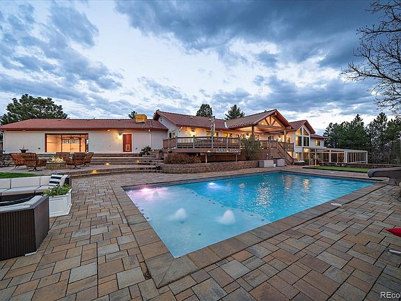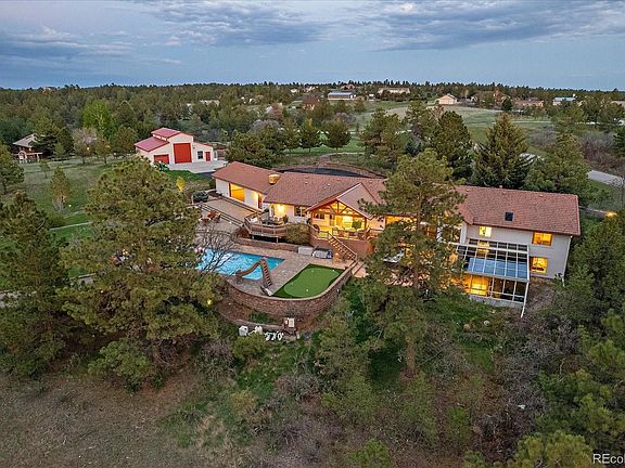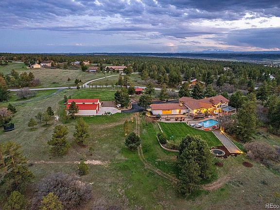 A seamless collaboration of a Luxury Mountain Resort and and a Sprawling Santa Barbara Retreat, comes Franktown's best kept secret- better known as 8247 Burnt Oak Trail. Majestically residing on one of the highest elevated 5-acre lots in the renowned community of Burning Tree Ranch where panoramic mountain views seem to go on forever! Brilliantly designed and executed with family and friends at the heart of it all, no expense was spared when creating this private and tranquil masterpiece. An Entertainers Dream- offering over 7,000 square feet, 6 bedrooms, 4 bathrooms, a home office, gleaming hardwood floors, a massive great room that is wide open to a state of the art "double-sized" gourmet chef's kitchen, an impressive and noteworthy indoor/outdoor home gym, a sun-drenched sun-room that flawlessly connects the outdoors to the indoors, soaring vaulted ceilings and over sized windows that perfectly frame the lavish outdoors, a luxurious master suite surrounded by towering pine trees that serve as the backdrop, and so much more! Outdoors you will find a 2,200 square foot barn complete with RV parking, vehicle parking, and a 3rd bay to house your tools or your horses, a chicken coop, an oversized garden, a 5 car attached garage with "through" overhead doors suitable for wedding receptions or large gatherings of any kind, and the most exquisite and memorable backyard haven offered in all of Douglas County. An in-ground heated pool with a slide and water features, a zip line, a bocce ball court, multiple leveled grass fields suitable for outdoor sports or any of your outdoor needs, gas fire pits and grounds for leisure, and the list too goes on and on! Everything you have ever dreamt of has arrived! **SUPER LOW TAXES** Located just 1 mile off of Parker rd, 10 min to Parker, 10 min to Castle Rock, and 10 min to Elizabeth, this once in a lifetime opportunity grants you the lifestyle of secluded luxury yet has the convenience of being right in the city! Nothing compares!
