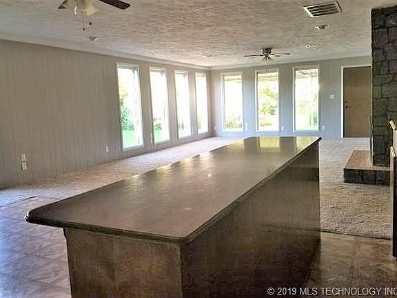 Large living areas-Back living area has lots of windows, wet bar & fireplace. Kitchen has breakfast bar, double sided fireplace. Covered back patio, storm shelter. Large shed/shop with electric. Lots of room for entertaining.