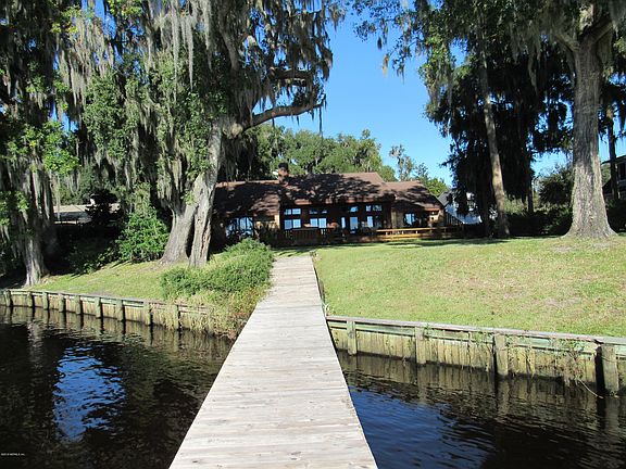 On a high bluff under A Century Oak canopy is a Timeless, Rustic, California Style with expansive glass and tall ceilings looking south over miles of the mighty St Johns River. For expanding families, there is a separate 1/1 Garage apartment. For the car enthusiast there are 5 car spaces with a mechanic's pit and storage galore. Walk through the sun room with wet bar and step up into well appointed kitchen with modern appliances, 42'' custom cabinets & solid surface counters. The living/dining area is open with dramatic, soaring ceilings, high glass and flagstone fireplace. The master suite features its own fireplace, modular closets, sunken tub and glass enclosed shower. Stairs lead to a railed walkway, overhead and huge upstairs bonus room. 4 sets of ''Andersen'' Atrium doors lead
