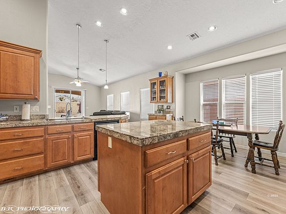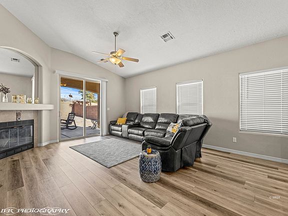 This 3 bedroom 2 bath home is ready to move in and start enjoying Mesquite! Luxury Vinyl floors all throughout home except bedrooms which are carpeted, and roomy, main bath has soaking tub and Glass paneled stall shower with 2 separate sink areas. Main bedroom has sliding glass door out to it's own covered patio, In one bedroom is a beautiful Murphy Bed which remains in home for those guests who stop by. Granite countertops in this bright and large kitchen with center island that has drawers and storage. Sit and enjoy wood burning fireplace on those cold winter nights. The covered patio off living room and main bedroom are just the ticket when wanting to sit and enjoy our beautiful summer evenings. Home backs up to common area so it feels wide open with block wall fencing all around.