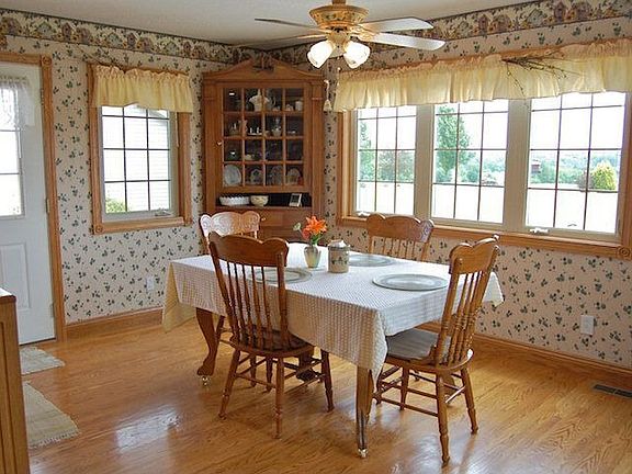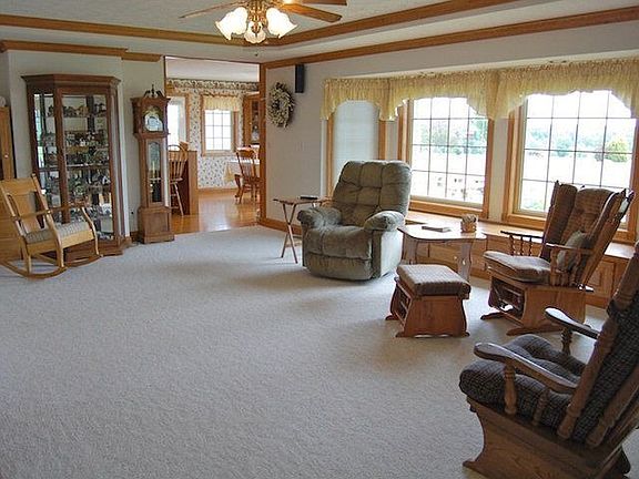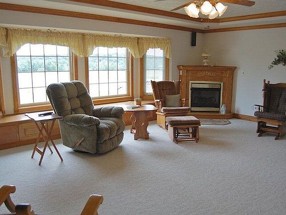Spectacular views include the stocked 11 deep pond and private countryside. Inside a 29 x 14 hickory kitchen with oak floor and Corian counters is the perfect gathering area that opens to the great room with coffered ceiling and gas log fireplace. Geothermal heat, Hurd windows, and built-in vacuum. Walkout basement divided for rec room and workshop with 220 AMP electric. Additional 24 x 20 detached garage.