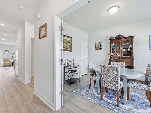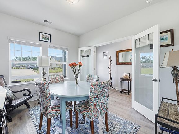Welcome to this barely lived-in gem located in the desirable 55+ community of Hammock Walk Villas in Nexton. Designed for both comfort and style, this home offers thoughtful upgrades and a flexible layout that fits a variety of lifestyles. From the moment you step inside, you're greeted by durable, neutral-toned luxury vinyl plank flooring that runs throughout the main level, creating a seamless and modern feel.Just off the entry, a versatile flex space with double doors and a closet can be used as a home office, reading room, dining, or even an additional bedroom. The kitchen is a true centerpiece, featuring white cabinetry with brushed nickel hardware, a farmhouse sink, solid white countertops, a warm grey tile backsplash, stainless steel appliances, and convenient bar seating perfect for casual dining or entertaining guests. The main-floor primary suite offers both privacy and elegance, with additional windows the builder no longer offers, allowing for extra natural light. The spacious ensuite bathroom includes dual sinks and an oversized walk-in shower with a tile floor. Upstairs, you'll find a generously sized secondary bedroom along with a charming loft area ideal for a desk, reading nook, or decorative display. Additional features include five-panel interior doors, blinds throughout, a glass-pane front door, an in-wall Taexx pest control system, a home alarm system, a covered rear patio, and a brand-new custom fence and gate. The backyard is lined with mature Carolina pines, providing both privacy and a peaceful, natural setting. Washer, dryer, refrigerator, window treatments, and garage door opener are all included, making this home truly move-in ready. Residents of Hammock Walk Villas enjoy access to exceptional community amenities including a dog park, pickleball court and patio, scenic walking and biking trails, and a tranquil pond with pavilion seating. This home combines low-maintenance living with high-end finishes and a welcoming community vibe. Schedule your private tour today and experience all that this special home has to offer.