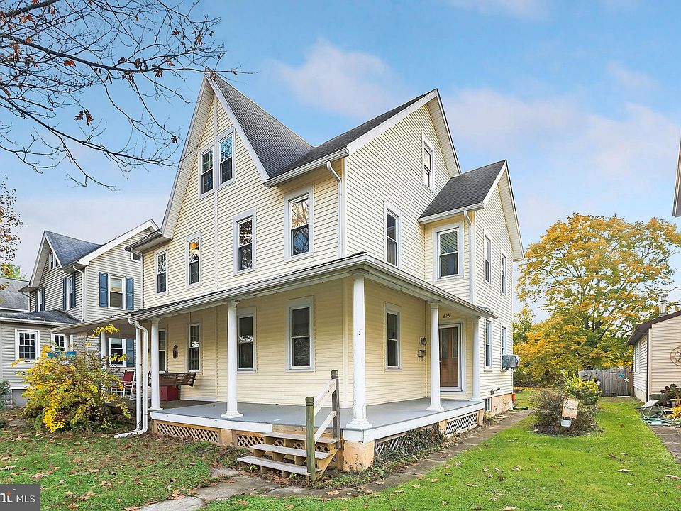 Welcome home to this wonderful twin located in the quaint town of Palmyra that is just a few short blocks from the downtown area and the River Line Station. Enjoy your morning coffee on the beautiful front sitting porch. The living and dining room have gorgeous hard wood floors and the spacious kitchen is located at the back of the house along with a full bath. The laundry room is conveniently located off the kitchen with access to the backyard. On the second floor you will find three good sized bedrooms as well as a second full bath. Under the carpets are hardwood floors. Moving to the finished third floor you will find a very large bonus room with a walk-in closet which could easily make a 4th bedroom, a home office, or a wonderful playroom. Philadelphia is a quick 20-minute car ride or take the train from the River Line Station. Come check out what this pleasant town has to offer!
