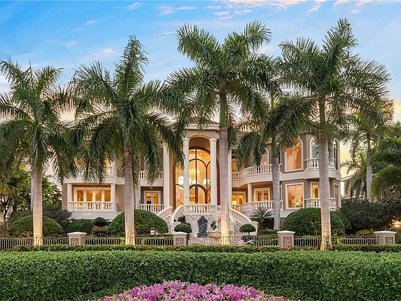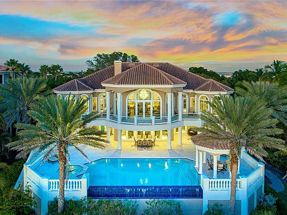 The majestically sited Villa del Sogno beachfront residence stands securely behind the gates of the Longboat Key Club in a separately gated enclave of eight privately gated beachfront estates. The property centers attention on the Gulf of Mexico with its vivid sunsets and dynamic vistas. Proceeding through elegant double gates to the circular drive, visitors ascend the broad staircase to a two-story portico and grand mahogany and glass double doors that lead to a marble foyer. The grand stair leads to a formal living room with a marble fireplace, formal dining room, central kitchen and catering kitchen, master en suite and wood-paneled office. Custom appointments abound as discerning owners demand. An imperial staircase featured in The Wall Street Journal and, in itself a dramatic work of art, spectacularly frames the entryway. The entry foyer also leads to the first level, which includes a family room, four guest suites and a guest kitchen opening to the infinity pool, spa, gazebo and terraces overlooking the pristine beach and azure sea. The first level serves utilitarian functions, housing more than four motor vehicles and storage.