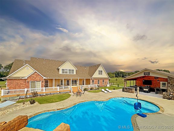 6 security cameras, doorbell camera, motion sensor upstairs and downstairs, CO2detector, window shatter monitoring, and open window detectors (all upstairs windows and bedroom downstairs). Remote capability through app to adjust thermostats, turn on lights, open garage doors, and unlock/lock front and backdoors. Other bonus features are a sprinkler system, 4 garages, a large fenced yard, fishing pond, Generac generator backup. This home offers a Blue Haven custom Gunite pool with Lifetime Transferable warranty with a Natural gas Hayward heater, it has a remote that can turn on water slide, water fall, and bubblers for shallow end it has an extended concrete deck and composite deck for added space. It also uses infrared light to clean the pool water. The outdoor pool cabana has a large outdoor kitchen with a kegerator, two fridges, built in wine rack, dishwasher, sink, garbage disposal, gas wood fireplace, and bathroom. The Interior of the home highlights a jacuzzi tub, gas and electric fireplaces, gourmet kitchen with roll out spice rack, laundry room with folding and sink area, and a dedicated office space with private entrance. The upstairs offers a versatile space for entertainment or relaxation. With endless storage, 2 driveways, and a registered Safe Room, this home is perfect for those seeking both luxury and practicality. Amenities that are an option to covey with sale are the Pool Table, formal dining set and china cabinet, Chlorine hot 6 seater TUFF spa hot tube and it is wired directly to its own 220V breaker, living room and master bathroom TV, entry way foyer table, and living room end tables. This exceptional property is located close to all hospitals and schools! Call today
