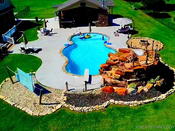 Water fallWater slideFishing pondOutdoor pool cabanaOutdoor kitchenComposite deckLarge fenced yard
