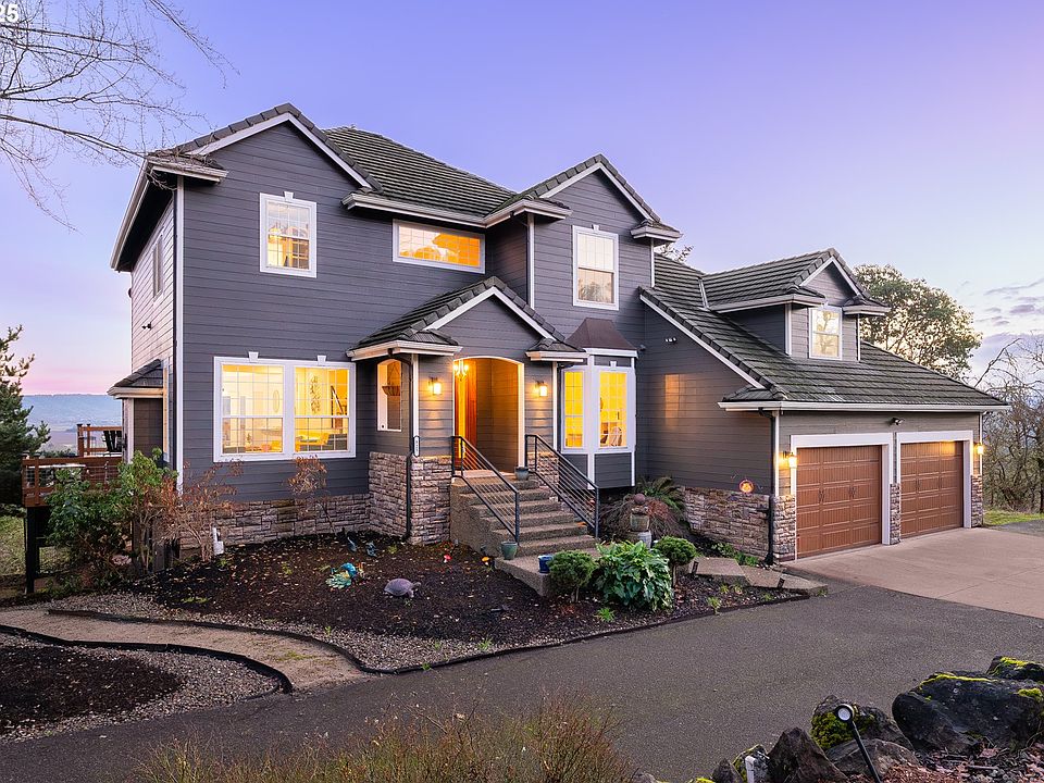 Nestled on 5 serene acres in the sought-after Garden Valley area, this 4-bedroom, 3.5-bathroom home offers 4,219 square feet of thoughtfully remodeled living space with breathtaking views of the Umpqua Valley and nearby vineyards. Spanning three levels, this home combines modern elegance with functional design and a second kitchen for the possibility of a dual-family setup! The main level is designed for both comfort and entertaining, featuring a stunning remodeled kitchen complete with a large island, stainless steel appliances, and a walk-in pantry. Oversized windows flood the expansive living areas with natural light, while high ceilings and gas fireplaces add sophistication. The formal dining room, with its inset ceiling and tongue-and-groove details, showcases fine craftsmanship and style. Hardwood floors tie it all together, creating a seamless and warm ambiance. Need flexibility? The office on this level could easily double as a fifth bedroom or cozy den. Upstairs, you’ll find three bedrooms, including the primary suite. The luxurious master bathroom feels like a private spa, featuring marble-style tile, dual vanities, and a freestanding soaking tub. A generous walk-in closet completes this standout feature. The lower level offers its own separate entrance, a full kitchen, and an additional bedroom, making it perfect for a two-family setup, mother-in-law suite, or guest quarters. With its own living area and deck access, this level is a versatile space with many possibilities. Step outside onto the expansive decks and take in the panoramic vineyard and valley views. Whether enjoying a quiet morning coffee or hosting, the views are some of the best in town. This property combines upscale living with thoughtful details, all in a prime rural country location just minutes from town, Roseburg country club, wineries and golf courses. If you’re looking for a modern, versatile home with unbeatable views, this one is not to be missed! Schedule your private tour today!