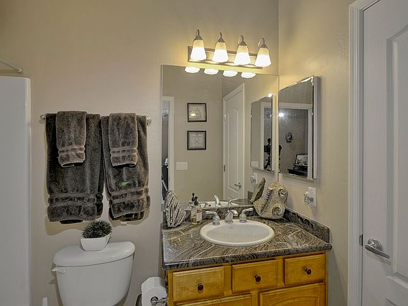 Wonderful open floor plan that is perfect for entertaining and easy to keep clean. Large living room features gas fire place, built-in nooks and opens on to covered patio that is extended by pavers. Low maintainance is the name of the game. The kitchen features granite counter tops, lots of storage space, and open bright dining area. The master bedroom is oversized, large walk-in closet, dual vanities and french door to the patio. Enjoy the mountain views from the front patio. The back yard is fully fenced, everything on drip and low maint. Oversized 2 car garage also has a bonus storage room, perfect for those treasures you need but not all the time.