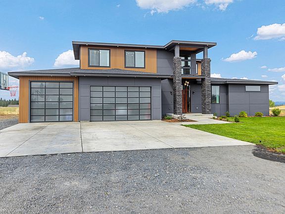 Discover this 2023 modern showpiece, where bold design meets natural elegance on 5 acres with sweeping Mt. Spokane views—just 10 minutes from downtown. A soaring 20-ft entry & striking staircase lead to a sunlit great room anchored by a towering fireplace and dramatic floor-to-ceiling windows. 16-ft retractable glass doors open to a covered patio with fireplace, creating an unforgettable experience. The gourmet kitchen impresses with an 11-ft quartzite island, Bosch coffee station, dual fridges, double dishwashers, & butler’s pantry, all complemented by a massive dining space. The luxurious main floor suite offers heated floors, a spa shower, soaking tub & private patio access. The main level is complete with 2nd bedroom/office, a refined mudroom & expansive luxury laundry space. Upstairs features a spacious 9-ft ceiling loft with three additional bedrooms and full bathroom. With a 3-car garage, RV hookups, custom lighting, panoramic views, this home blends luxury, lifestyle, and functionality like no other.