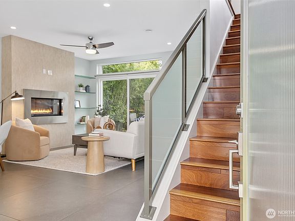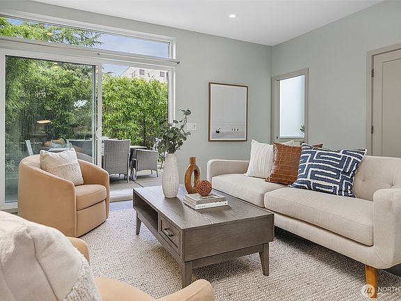 Just 3 blocks from Green Lake, this cozy, modern home feels like a secluded retreat. The main floor’s open layout features a well-designed kitchen that flows into the dining + living areas. Step out to the private yard for al fresco dining & relaxation. Upstairs is a primary suite w/walk-in closet, 2 large bedrooms, 2nd full bath, & laundry. The 3rd floor is a hip family room w/wet bar, half bath, & south-facing rooftop deck—with the backdrop of majestic trees, it is perfect for entertaining, enjoying sunsets & stargazing. Large windows provide tons of natural light. Spacious garage, new roof, new A/C, & more. Enjoy some of the city’s best recreation just down the street. Easy commute to downtown, light rail and all of Seattle’s amenities.