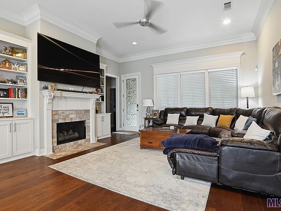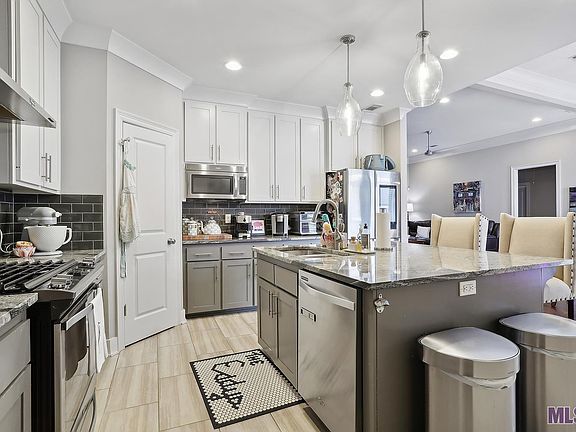 Take a look at this stunning custom Stafford built home in University Villas! From the open floor plan to the high-end fixtures and private backyard, this home has it all! *Freshly painted walls, ceiling and molding in living room and kitchen* The kitchen features 3" granite countertops, glass subway tile backsplash, and two-tone ceiling height Shaker style cabinets, all in a trendy yet timeless color palette. The kitchen also boasts stainless steel Whirlpool series appliances, including a gas stove, large island and corner pantry. The living room offers wood floors, 11' ceilings, triple crown molding, and a ventless gas log fireplace flanked by built-ins. The mud room has convenient built-ins, LED lighting throughout the home, and a whole new Vivint alarm system; including 3 exterior cameras. The system is fully paid off, granting you full ownership with its advanced features and reliable performance. The large master bedroom features a walk-in closet and en-suite with 3" granite countertops, double sinks, jetted tub and separate shower. These two additional bedrooms offer a perfect blend of style and practicality, featuring brand-new luxury vinyl plank tile flooring. Enjoy your back porch year round with a newly installed automated screen that descends smoothly at the touch of a button. Your backyard oasis has a beautifully crafted fire pit design with spacious seating area, brand new 6' privacy fence with new aluminum wrought iron gate, and backs up to a wooded area. The French drain is subtly incorporated, blending effortlessly with the surrounding rocks and greenery. University Villas is a gated community with a private lake, three fountains, walking trails, swimming pool, and clubhouse. Great location, just minutes to LSU, restaurants, and shopping. Schedule your private showing today!