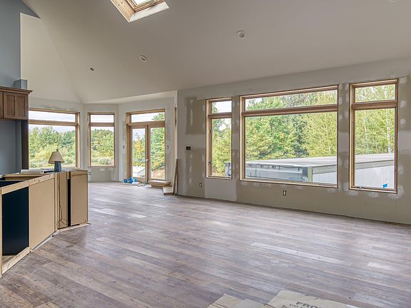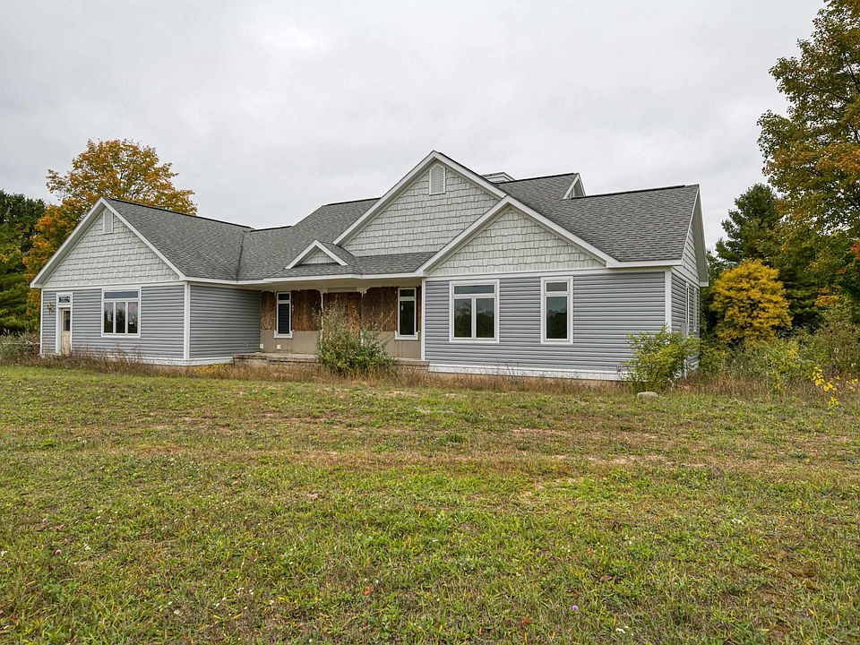 Nestled on a generous 13.06 acres of land (Agriculturally zoned), this 4 bedroom (4th BR in lower level), 4 bath (3rd & 4th baths in lower level) Ranch-style home offers privacy and serene countryside views with a unique opportunity for personalization. While portions of this home are already complete with high quality finishes, significant areas remain unfinished, providing a canvas awaiting your vision. This home offers high quality engineered hardwood floors, rich maple cabinets, Kolbe windows, in-floor heat and vaulted beamed ceilings. With an ideal open floor plan, the main floor includes the primary en-suite with a slider door ready to be installed, 2 additional bedrooms, an additional bathroom and a den/office. The walkout lower level includes a large rec area, in-floor heat, 1 bedroom and 2 bathrooms. For those needing storage or workspace, the oversized 3-car garage with docks planking precast cement floors, and the 30' x 34' garage in the lower level are notable features. Experience designing your dream home while enjoying sunsets against a backdrop of cherry trees and picturesque views. (Main level is about 90% finished and the lower level walk out is about 50% finished - being sold As-Is, ready for you to make it your own). Pending land division approval. The accuracy of all information, regardless of source, is not guaranteed or warranted. All information should be independently verified.