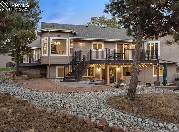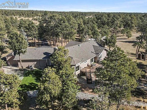 Phenomenal opportunity in sought after South Black Forest w/ a custom built rancher featuring over 3,800 sq ft on almost 5 treed and meadow acres! This property is directly across from Section 16 which is 640 acres of El Paso County owned treed open space w/ walking, biking and equine trails. All paved roads to property w/ newer asphalt lighted driveway. Three main level bedrooms, main level laundry, two lower level bedrooms and two office spaces. Zoned for horses w/ a 16x24 outbuilding formally used as stalls. Amazing outdoor entertaining space w/ two high end composite and metal decks to relax and take in the peaceful surroundings. Huge stone paver patio w/ built-in wood burning fireplace and stone retaining walls. Beautiful mixture of Ponderosa Pines, Spruce and Aspen trees w/ lush green meadow, meandering rock beds and a putting green. The great room is bright and welcoming w/ vaulted ceilings, hardwood floors, gas fireplace with custom built surround and mantle w/ a walk-out to one of the new composite decks. Spacious kitchen w/ slab granite counters, stainless appliances including a gas range and a kitchen nook with bay window. Large primary suite w/ walk-in closet and a 5 piece bath complete w/ a huge jetted tub, shower w/ seamless surround and double vanity. Fully remodeled main level bath w/ double vanity, roman tub w/ high end tile and hardwood floors. Fully finished walk-out lower level w/ two additional bedrooms, a full bath, large office and bonus room w/ custom made solid wood barn doors. The lower level family room has a high end wood burning stove and walk-out to back paver patio. Expansive and separate formal dining w/ reclaimed barnwood wall, sitting area and a walk-out to the new composite deck which could be used as a living room or formal dining. The acreage has been well taken care of and fire mitigated. Convenient location only minutes from amenities. Award winning School District 20! No HOA or covenants. Outbuilding and animal friendly.