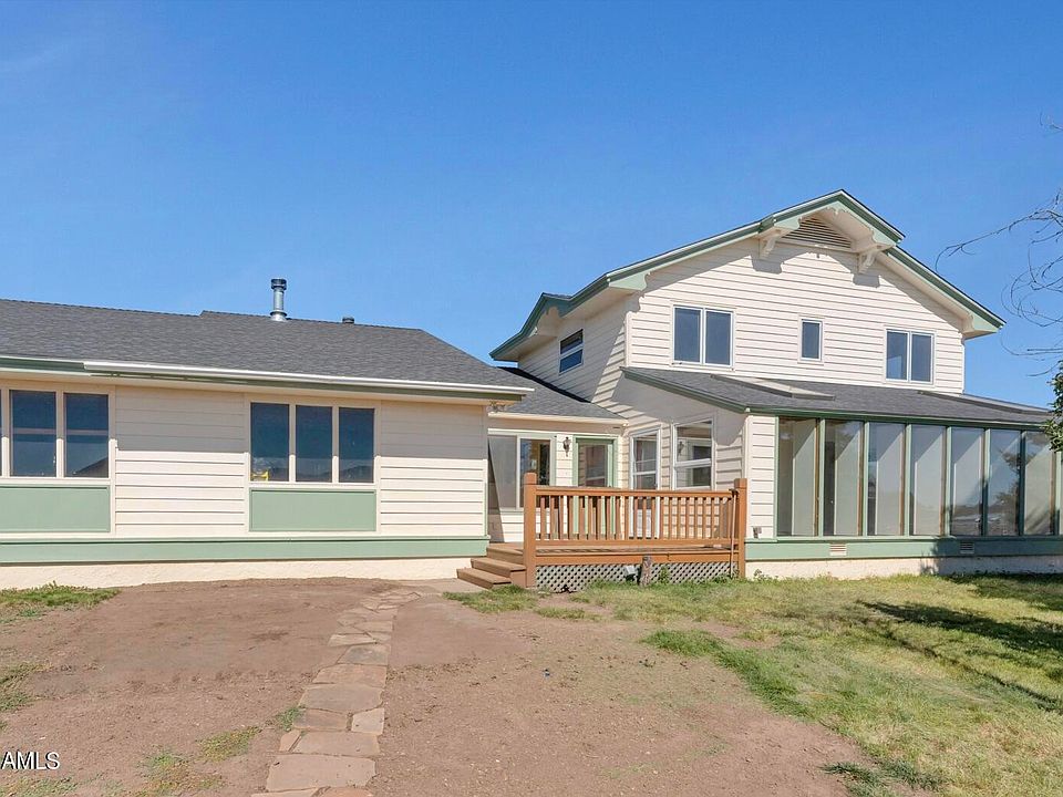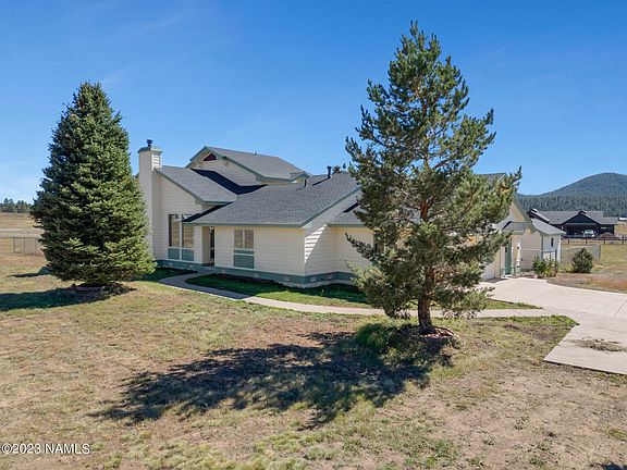 Welcome to this Fort Valley home nested at the base of the San Fransisco Peaks on the north side of Hwy 180. 2.5 acres allow you to immerse yourself in the rural NW lifestyle close to hiking, skiing and the great outdoors. This home presents the opportunity to enjoy the stunning view in a comfortable environment. Located in an area of new custom homes, this is the place to call home. The sun room will keep you warm all winter with passive solar windows and skylights. The wood stove in the lviing room warms the entire home in the cooler months. The living room has dramatic floor to ceiling windows and a beautiful staircase to the upper level. The kitchen had lots of couter space and a big pantry. Primary bedroom on main floor. Two bedrooms and full bath on upper level The oversize two-car garage has plenty of room for a shop or office area. Exterior features paved driveway, fenced in yard area, ponderosa pines and asphalt driveway. Bring your pets and chickens and the coop is alreay provided. Natural gas and a private well.