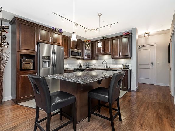 YORKSON CREEK in the heart of Willoughby! This beautiful end unit features 2 bedrooms, 2 bathrooms, and a den, plus an impressive wrap-around solarium deck ideal for year-round enjoyment. Thoughtfully cared for, this home has been maintained in exceptional condition. The gourmet kitchen showcases stainless steel appliances, rich wood cabinetry, granite countertops, and a large island perfect for both cooking and entertaining. The primary bedroom offers a spacious walk-in closet, a spa-inspired ensuite, and direct access to the solarium. Located just steps from shops, schools, parks, and transit—this one truly has it all!