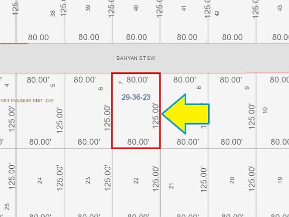 One of 2 side-by-side adjacent lots available in Port Malabar Unit 49 of Palm Bay (the other is 816 Banyan). Located in the southwest section, this buildable residential lot is just 1.3 miles - 4 minutes to Bayside High School, 2.5 miles - 7 minutes to the Publix Supermarket, 14 miles - 32 minutes to Melbourne Airport, and 17 miles - 38 minutes to the beaches of Indialantic. From exit #176 of I-95 go west on Palm Bay Road for .7 miles, left on Minton Road for 3.3 miles, right on Jupiter Boulevard, left on DeGroodt Road for 2.5 miles, right on J.A. Bombardier Boulevard for .9 miles, left on Madden Avenue for.1 mile, and right on Banyan Street. The lot will be on your left.