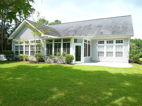 This lovely and inviting 4BR/3BA home in Pebble Creek views the 2nd tee of the International Club golf course. Built on an end lot with woods to one side and the golf course behind, it is an ideal spot for enjoying relaxation on the back patio, sunroom or carolina room, all with views of the course. This Sunbelt home offers detailed touches of crown molding, 9' ceilings, large windows and transom windows to let in the natural light. Morning sun in the open kitchen/carolina room is gloriously inviting for a leisurely breakfast or coffee and the paper. The formal dining room with trey ceiling adds an elegant touch to entertaining. A 2-car garage with workbench. This home also features a home security system, surround sound and irrigation system. Located close to shopping, the ocean, Murrells Inlet Marsh Walk, as well as Huntington Beach State Park.
