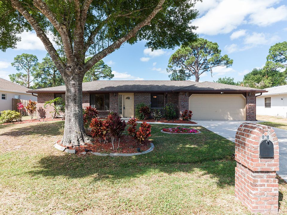 Cozy and well-kept NW Palm Bay home. Brand new air conditioner with transferable 10 year warranty! Split floorplan with separate living and family rooms. Enjoy the fireplace and huge covered patio with insulated roof, outdoor bar with refrigerator, and hot tub. Garage has been converted to additional under air living space which can be used as an expansive 4th bedroom, office space, or bonus room (easily converted back if desired as garage door still in place). Additional features include a spacious fenced yard, UV water purifier at kitchen sink, washer and dryer, ceiling fans, rain gutters, and sprinkler system.