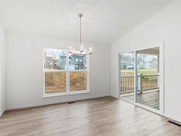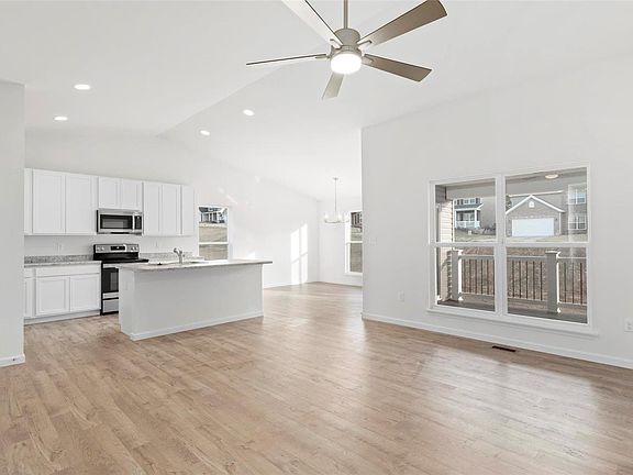 This McBride Homes new construction Aspen II Ranch model features 3 bedroom 2 baths and will be ready this winter! Great open floorplan with vaulted ceilings, 6ft windows, and beautiful wood laminate flooring throughout main living areas. Covered future back patio area with sliding glass doors off dining area. Kitchen features large island with flush countertop for breakfast bar, white 42in tall cabinets, stainless steel GE appliances, and a large walk in pantry. The master suite features large window, dual closets including one large walk in closet, and the private master bath features an adult height double sink vanity and walk-in shower. Upgraded carpet and carpet pad in bedrooms. Ceiling fan in family room and pre wires for ceiling fans in bedrooms and future patio area. Charlestowne Landing located next to New Town, features common ground and beautiful lakes, & included in the Orchard Farm School District. McBride Homes' 10 year builders warranty! Similar Home Photos Shown.