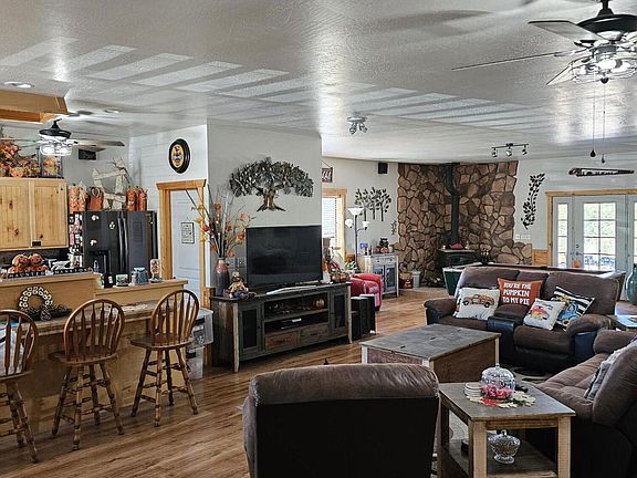 Pull into the covered entry driveway and enjoy the beautiful mountain views and wildlife visitors! This home welcomes an open living area, split floor plan with spacious bedrooms and two extra-large baths, with wide doorways and hallways. Entertain family and friends inside or gather out on the patio! Central Air and Propane heating as well as a wood stove. The garage includes extra space for a workshop or projects. Need even more storage? This home sports an attic with pull down ladder. The metal roof and metal wrapped facia provides extra protection from the outside elements. The property has a full RV hookup with 50-amp service as well as one outbuilding with water and electricity and one shed for your extra storage needs! Extra water boxes throughout the acreage for new landscaping projects! This home truly has it all!