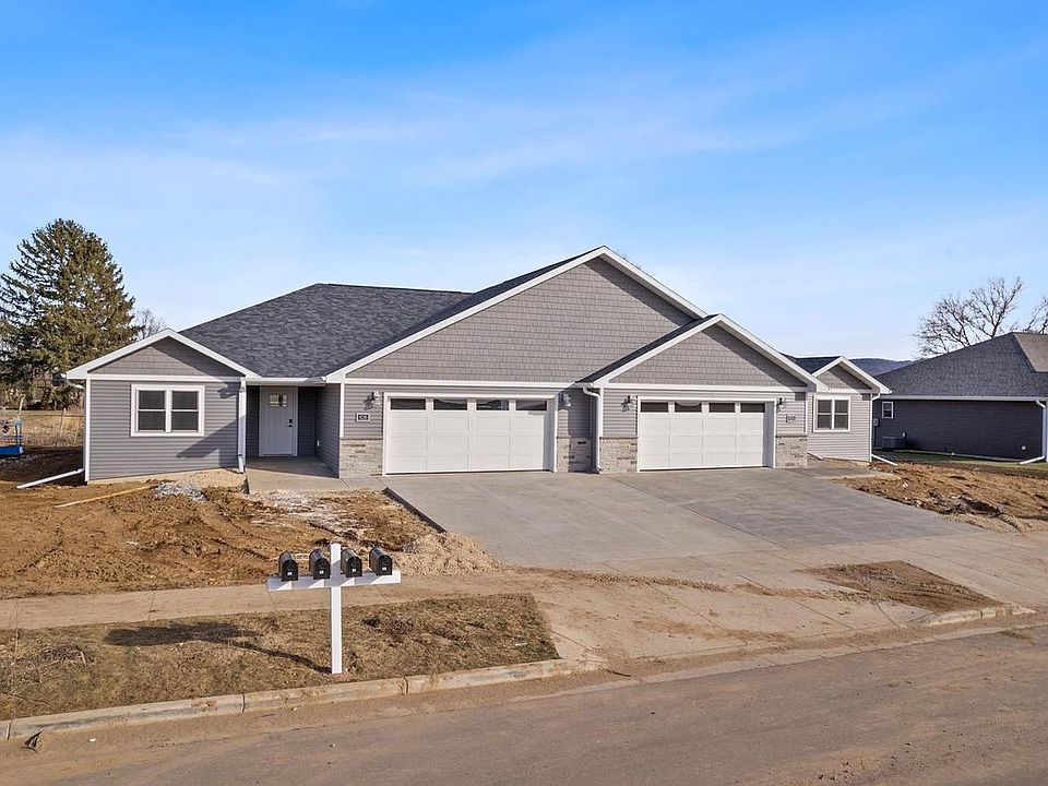 Welcome to Greenfield Reserve - Your Home for New Beginnings! This ZERO LOT LINE offers is open concept with 2 bdrms and 2 baths, main level laundry and covered back porch with a view of the bluffs. Enjoy quality finishes including Amish-made self closing cabinetry, quartz counters, Malarkey roof, LVP flooring & stainless appliances. Lower level has egress windows and stubbed bathroom for future expansion. Each 2-car garage features an electric vehicle charging port. Neighborhood perks include city water/sewer, sidewalks, future park & conservancy with trails! Less than one hour drive to either side of Madison!
