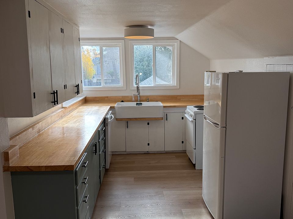 Offering for rent a fantastic 1-bedroom/1-bathroom apartment near historic downtown McMinnville. Rent for this apartment is $1,350/month plus each tenant pays $40/month as a water/sewer supplement. Tenant is responsible for their own electric bills (lighting and heating) and any phone or Internet desired. Owner pays for trash/recycling. We will require a strong rental history, good credit and a $2,000 fully refundable security deposit. No last month's rent deposit is required. One (breed/weight restrictions apply on a case-by-case basis) are acceptable with $35/dog pet rent. Maximum 1 animals of any kind total. This is a smoke-free building, so no smoking in the unit, on the decks, or within 30 feet of the building. This units at this property are not legally classified as disabled accessible units. This apartment features the following amenities: --Hardwood flooring in the kitchen and living areas and in the bedroom. --Refinished cabinets with pulls. --Kitchen appliances including apartment sized-range, apartment-sized fridge, full-sized dishwasher, and garbage disposal. --Large bedroom with closet space. --Baseboard Heating. --Newer vanities, tile, mirror, lighting and fixtures in the bathrooms. --Off-street street parking available. --Washer and Dryer in unit. Easy access to Linfield College and downtown McMinnville. Walkable to downtown, Great Harvest, Linfield College, and City Park. This unit is above the landlords home, so it needs to be a good match for both tenant and landlord. The staircase up to the apartment is very steep so someone with disabilities may not be able to access the apartment.