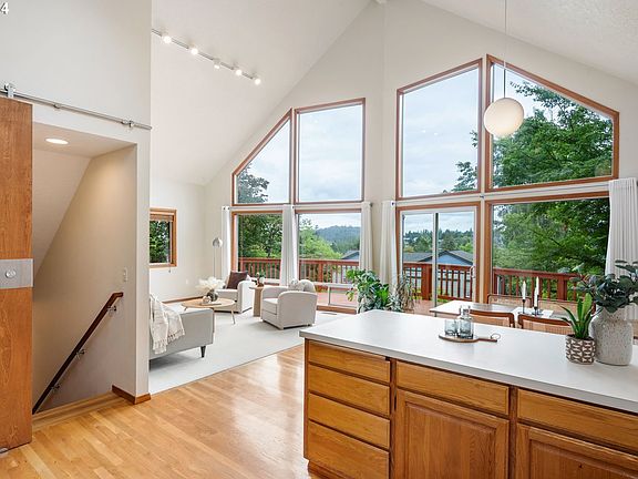 Your chance at chalet living in Gresham is here! This custom NW contemporary home features floor-to-ceiling windows overlooking pine speckled hills and historic Gresham. Enjoy those same views from the lofted primary suite with walk-in closet and jetted tub. The light and bright living area seamlessly flows to the kitchen and adjacent dining area with vaulted ceilings and warm wood accents. Spend sunshine filled days in the thoughtfully cared for garden surrounding the 360 degree wrap around deck. Two car garage plus ample storage in the basement. Only 30 minutes to downtown PDX and 40 to Mt. Hood village for all your outdoor fun - the perfect balance of city and mountain living. Easy access to all the fantastic shops, restaurants and parks of downtown Gresham. New roof installed in 2022 with solar panels! New carpet installed 2024.