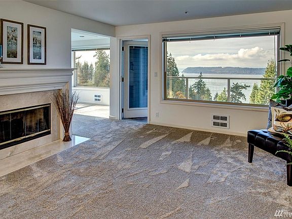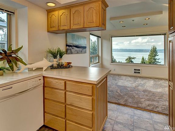 Stunning 3rd floor condo in Mukilteo with breath-taking views of the Puget Sound. The kitchen has solid wood cabinets with pull-out shelves, and opens to the dining room w/ huge picture window. The living room has light sensitive shades on west-facing windows & a wood fireplace for chilly evenings. Master bedroom is just down the hall with a 3/4 bath. With a 2nd bedroom, guest bathroom, in-unit washer and dryer, all new flooring, individual garage & elevator access you might never want to leave.