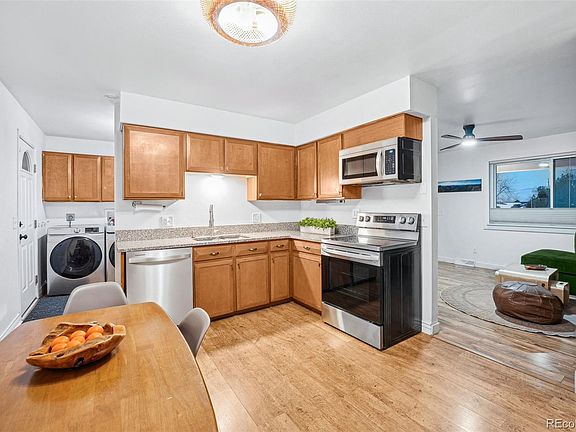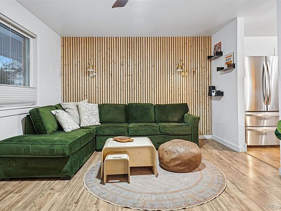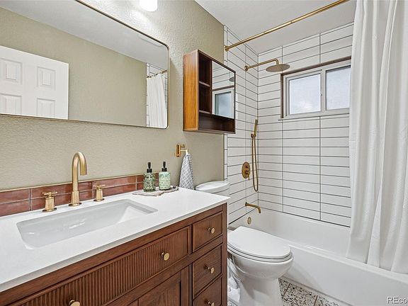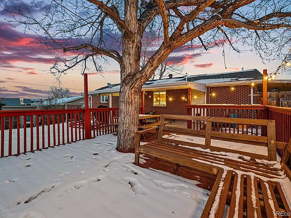 Charming and updated! This solid brick ranch home offers two bedrooms and a remodeled bathroom with mid-century modern design touches, including stylish terrazzo tile. The interior also features a welcoming and light-filled living room, a dedicated laundry room, plus a spacious eat-in kitchen with newer appliances and ample storage. For expansive, indoor-outdoor living, don't miss the sprawling backyard where you'll find a covered patio, a large deck with built-in seating areas, a large shed/workshop with power, a chicken coop, raised garden beds, play structure, and sprinkler system for easy lawn care. Completing this home is an attached, one-car garage, extra storage, and a carport. Along with convenient I-25 access, this home is located on a parkway with lush green space right across the street. Welcome home!