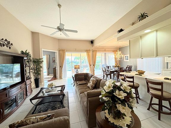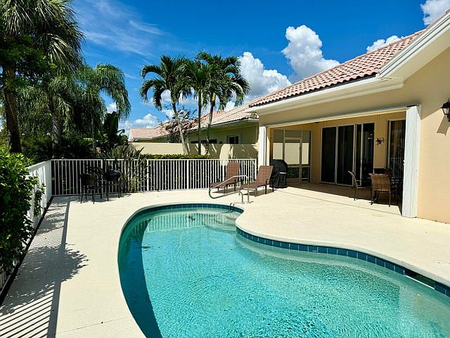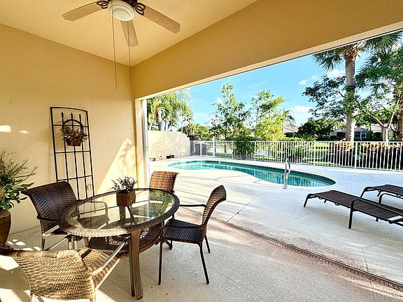 Available from April 2025. This beautifully decorated turn-key home is the best-priced in the Villagewalk, gated Resort style community of Wellington. This 3-bedroom plus den, 2-bath, 2-car garage home features a heated free-formed pool, a fenced patio, and is situated on a premium lake lot near a cul-de-sac. The interior boasts beautiful crown and decorative moldings throughout the home and ceilings, tiles in the living areas, and wood flooring in the den and all bedrooms, which include California closets. The home is equipped with a central vacuum system. The den includes a custom built-in wall unit. The spacious kitchen offers 42'' cabinets with rope molding and an open layout to the living and dining areas. Cable TV, Internet, Alarm service, landscaping provided by HOA. The community offers resort-style living with a 24-hour manned gate and private security patrol. The town center includes a cafe, clubhouse, 2 heated pools, a playground, an exercise room, card rooms, a library, a catering kitchen and hall, a game room, tennis and basketball courts, pickleball, and bocce ball, as well as yoga classes. On-site services include a beauty and nail salon, post office, and children's play area. The location is prime, being close to Wellington Green Mall, equestrian and polo clubs, fine restaurants, hospitals, parks, golf courses, and beaches, and only 15 minutes to Palm Beach International Airport. The home is located within Wellington's "A" rated school district. Live the Florida lifestyle in a luxurious and secure community. Schedule your showing today! Offered $3800 per month with off season lease and $7000( everything included) for seasonal month, minimum 4 months.