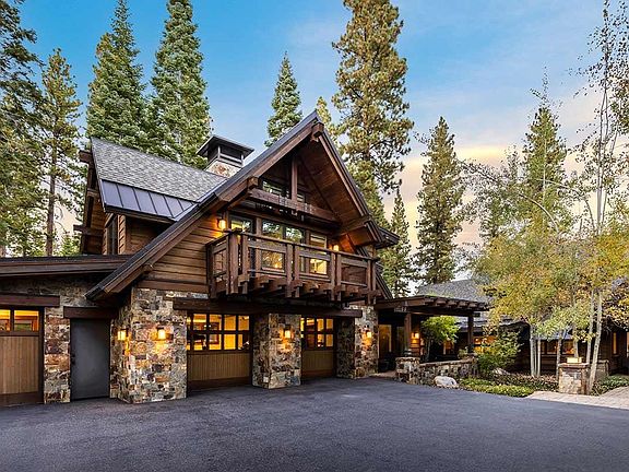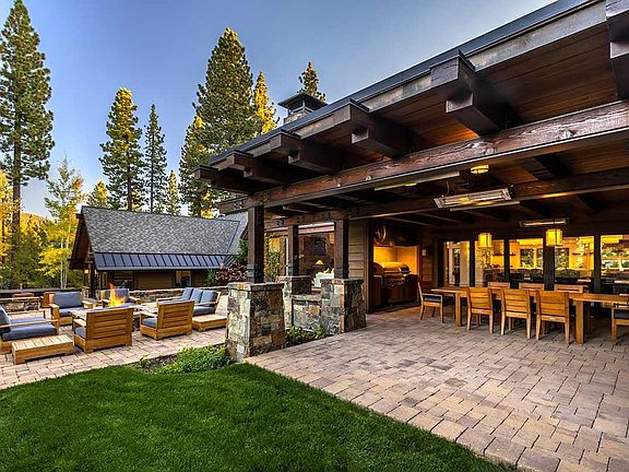 Centerpiece of this 7,842 sq ft, 6-bed/ 6.5-bath Martis Camp home is a patio that showcase views of the 1st fairway on the Tom Fazio golf course, Carson Range & Lookout Mtn. With gardens, forests, firepit and hot tub, it’s the ideal venue for relaxing or entertaining. Two bunk rooms by the media room are connected by an airy, inspiring loft. There’s a large office by the primary suite, a separate living area with bedroom and kitchen above the garage and a separate guest house with its own fireplace, kitchen and covered patio.
