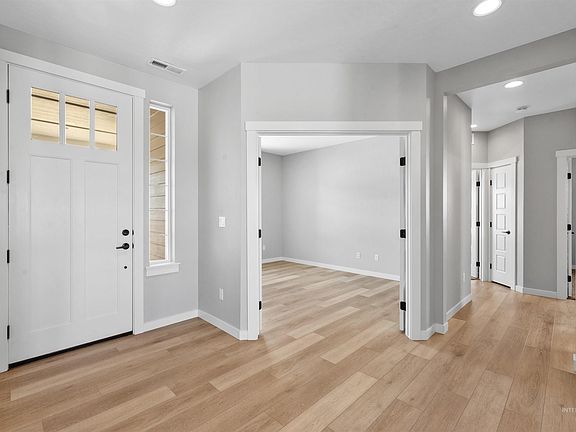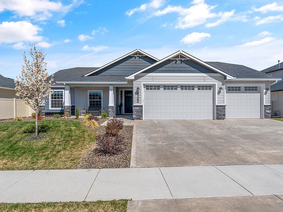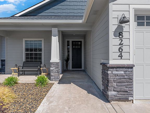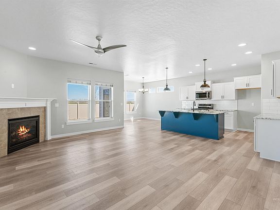 Experience Nampa living at its finest! Stunning single level floorplan by MRH Homes, with a spacious design and fabulous finishes in the newer Ridgevue Estates community. The model offers 3 bedrooms + office, and an OVERSIZED 3+ car garage. Enjoy a beautiful kitchen with an expansive island, cabinetry with soft close doors & pull outs, gas range, granite countertops + walk-in pantry. Other upgrades include granite countertops throughout, LVP floors, corner fireplace, custom blinds, covered front porch, covered back patio with extended stamped concrete, garage epoxy flooring, hand-troweled wall texture, 9' ceiling, 8' entry door, full gutters, and more. The property is fully fenced and landscaped, and sits on a prime south facing lot with no rear neighbors. Supreme location — easy freeway access, and moments to schools, shopping, dining & entertainment. Your new chapter begins here!