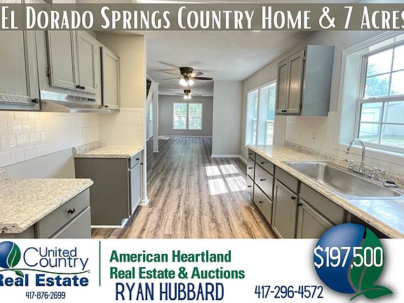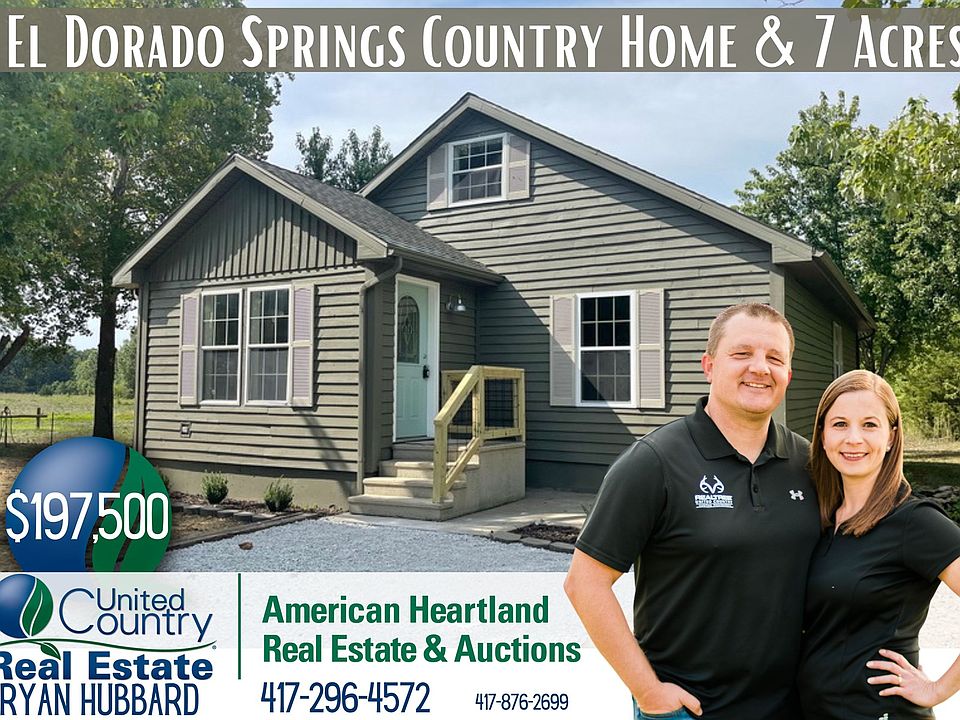 Completely Remodeled Country Home on 7 Acres For Sale in Cedar County Missouri For Sale This cottage style home outside of El Dorado Springs, MO is a MUST SEE! With a complete makeover, inside and out, this house is turn-key ready for its new owners to make it a home. This 3-bed, 2-bath home has over 1200 square feet on the main level with an additional 220 square foot finished loft space that could be used as an office, a rec room, or play area. Bright new lighting, new fixtures, new flooring, new paint have all been completed with excellent finishes making it feel like a brand-new home. As you walk through the front door you will see the open concept living room, dining room, and kitchen. The kitchen is stunning, with new paint on the wooden cabinetry; bright, flush-mount lighting on the ceiling; new countertops; and new fixture at the sink. Just off the kitchen is the utility room which seconds as a mud room entrance from the newly constructed back deck of the home. The bedrooms boast large closets and bathrooms have also been completely refinished including a jacuzzi tub in the master bath. The exterior of the home is newly painted with charming shutters; a new rail was built on the front porch to match the new deck on the back; and new landscaping has been established. A fresh load of gravel has been spread over the driveway that leads to the home as well as the 30'x40' detached garage & shop. This metal shop is in great shape and has concrete floor and electric. The home and shop sit on 7 acres in rural southwest Missouri but remain only 10 mins from town. The property is mostly pasture with a pond visible from the back porch. Start or grow your farmstead with plenty of space to grow a garden or orchard as well has for grazing a few cows or horses. Call today on this beautiful piece of real estate! From El Dorado Springs: Go East on Hwy 54 out of town approximately 6.5 miles. Turn north on DD Hwy and go just over 2 miles. Turn left (West) onto E 50 Rd to home on left (South) side of road. Watch for signs.