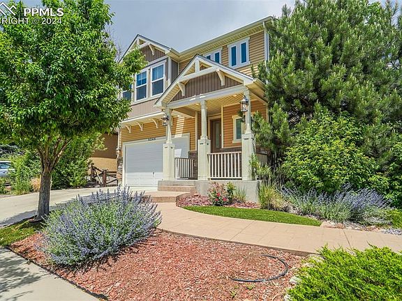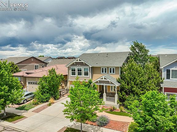 Stunning 2 story home w/finished basement in Banning Lewis Ranch! This craftsman-style home welcomes you with mature landscaping & a charming front porch. As you enter the home you're greeted with a foyer which flows into a bright & open concept floor plan. The living room features tray ceilings, recessed lights, built-in entertainment center & gorgeous hardwood floors. The kitchen opens up into the living room, great for entertaining. Kitchen features include a large granite island, quartz countertops, stainless steel double refrigerators, built-in wine rack, walk-in pantry. Walkout access from the kitchen to the covered patio (wired for outdoor speakers), extending to stamped concrete with an almost maintenance free backyard (artificial turf). Upstairs welcomes you to relax in the large primary suite with tray ceilings, a gas fireplace and adjoining bathroom. Primary bathroom features a double vanity w/quartz countertops, spa shower, and large walk in closet w/built-in shelves. The loft on the upper level makes a great space for an exercise, play or media room (wired for surround sound). Two additional bedrooms, both with mounted light fixtures, spacious closets and a shared full bathroom are also located on the upper level. Last but not least, the laundry room is conveniently located on the upper level. The fully finished basement provides extra storage, a spacious family room wired for surround sound and the 4th bedroom with walk-in closet & full bathroom. Finished/insulated 2 car garage, includes a hose spigot and side door with access to yard. This home boasts many upgrades including A/C, wired surround sound throughout and outdoor speakers, cordless custom built in blinds, quartz counter tops & more. Banning Lewis Ranch, is known for its community amenities which include a Recreation Center, Two Pools, splash pad, pickle ball courts, Gym, Dog Park, Over 50 Acres of Trails & Parks! Don't miss this gem it will not last long, call for your private showing today!