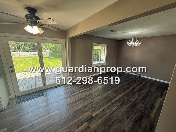 Cottage Grove house available now! Rambler with hardwood floors on the main floor. Three bedrooms and a full bathroom on the main level. Kitchen has granite counters and stainless steel appliances. There's a dining area and bonus room with a double sided fireplace. Walkout to the back deck from the dining area.