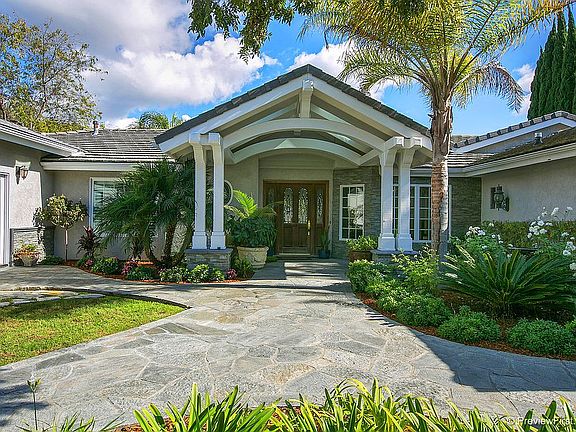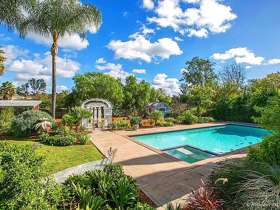Sought after single level custom home located in the desirable Olivenhain neighborhood, sitting on a usable .05 acre lot. Stunning curb appeal with a circular driveway and room for an RV or boat. Recently expanded and tastefully completed with the highest quality materials including combination designer stone and hard wood flooring, solid doors and windows and a fabulous gourmet kitchen. Expansive backyard complete with a sparkling pool, spa, Koi fish pond, fire pit and much more. Discover gracious living within the beauty of this one of a kind custom Olivenhain home embracing quality windows and doors, ceiling fans, a sunken living room, hard wood flooring throughout hallways, and designer stone with custom tile inlay flooring expanding from the entry way through the kitchen and family room. This 3 bedroom plus a fourth room or office embraces three full baths, two luxurious master bedroom suites, one suite with multiple windows and French doors opening to the front of the house, and the second suite overlooking serene backyard and gleaming pool. Lavish en suite bath with elegant wood shutters, stunning marble flooring and surround, granite counter tops, a jetted Roman tub, double sinks and a walk-in closet comprised with custom built-ins. Incredible architectural details continue into the light and bright gourmet kitchen, incorporating vaulted ceiling, well-designed cabinetry, tumble marble back splash, stainless steel appliances, granite counter tops and a ceiling fan alongside the Great room with multiple French doors opening to the blissful backyard. Relax pool side while enjoying lush landscape, a large lawn, a romantic patio, spacious wooden deck, Koi fish pond, fire pit and an expansive half acre usable land with endless possibilities.