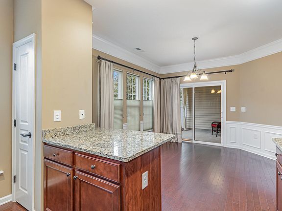 Beautiful, well maintained villa in the highly sought after location of 55 & 540! Glowing hardwood floors throughout with tile bathrooms & like new carpet in bedrooms! Plenty of trim work, lovely wainscotting in dining shows attn to detail in this home. Cozy yet open floorplan allows for ease of flow. 2 bds split plan, comfy den/office gives a private respite, large eat in dining off kitchen & private covered patio makes entertaining a joy! Cooks dream w/gas stove, tons of cabinets! Perfectly finished attached garage affords plenty of storage & dry entry! Laundry room tucked away yet easy access to drop towels after a swim. W/D convey with appropriate offer. Enjoy all this community offers with pool/tennis/gym and more, shopping/restaurants/highways within 3 mins. Hurry!
