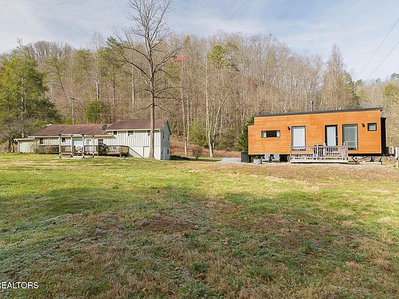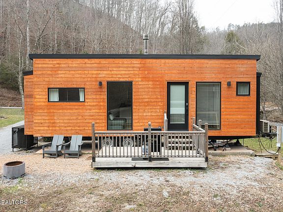 An incredible investment opportunity or private retreat awaits two fully furnished homes in one unbeatable location! Nestled on over an acre, this stunning property offers a spacious 4-bedroom, 2.5-bath main cabin and a charming tiny home that can be rented together or separately. Inside the main cabin, hardwood floors flow throughout, leading to a fully equipped kitchen with granite countertops and stainless steel appliances. The cozy warmth of two gas fireplaces sets the perfect atmosphere, while two updated full baths add a touch of modern comfort.