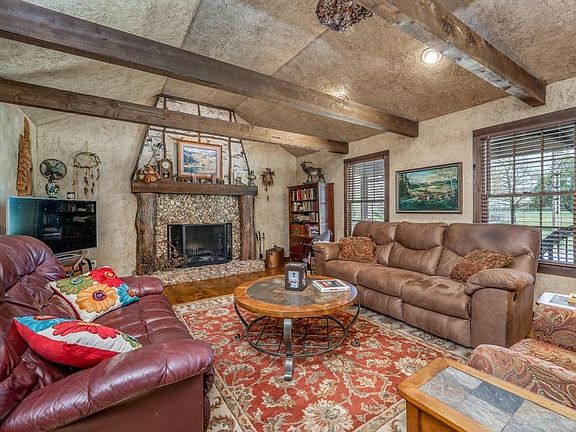 WOW! This is a one of a kind home! Rustic Lodge with many extras! Beautifully landscaped front and back! Enjoy evening sitting on your covered full front porch! Enter the home and admire the details to the Lodge Home! Beamed ceilings in the open Living room and dining room area with pine wood floors throughout the home! Log and stone fireplace in living room. Take your choice of master bedrooms! Split floor plan for bedrooms! 3rd bedroom is currently used as office - make sure you check out the hand painted doors pocket doors for kitchen and 3rd bedroom! Enclosed 7x33 concrete porch that leads to side load 2 car garage. Plus covered wood deck off the 2nd bedroom! Don't forget to check out the 15x24 Hobby building! Additional storage in 12x10 metal building with carport and 8x14 storage shed. Sprinkler system, Additional storage in floor attic in home! Crawl space is extra tall! RV parking with 30 amp electric hookup! Plus 2 city lots! This one is a MUST SEE!