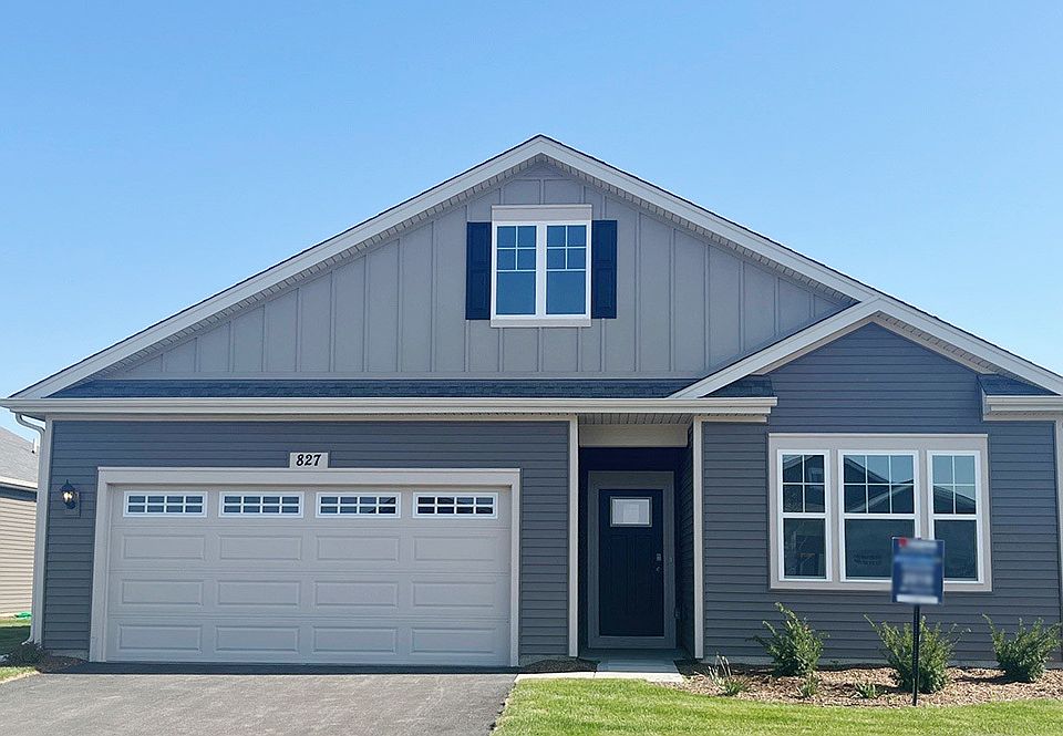 Envision yourself at 827 Plateau Drive in Pingree Grove, Illinois, a beautiful new home in Cambridge Lakes North. This ranch home is move in ready! This homesite includes a fully sodded yard and covered back patio. This Clifton plan offers 1,863 square feet of living space with a flex room, 2 bedrooms, 2 bathrooms, 9-foot ceilings and amazing closets! When you first enter the home, there is a secondary bedroom and full bath with closet space. Continuing into the home is the flex room and opposite the hall is the more closet space and HVAC room. Down the hall, you will enter the open concept great room and kitchen. The kitchen layout includes a large island with an overhang for stools, quartz counter tops with a stainless steel undermount sink, and smoke cabinetry. Additionally, the main floor includes easy-to-maintain Luxury vinyl plan flooring. Enjoy your private get away with your spacious primary bedroom and en suite bathroom with a raised height dual sink, quartz top vanity and walk in seated shower, tile surround and shower doors. All Chicago homes include our America's Smart Home Technology, featuring a smart video doorbell, smart Honeywell thermostat, Amazon Echo pop, smart door lock, Deako smart light switches and more. Exterior photo of actual home. Interior photos are of similar home and model home. Actual home build may vary.