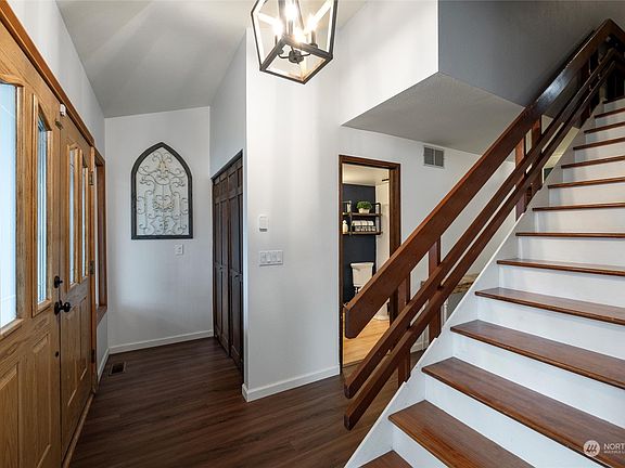 Beautiful mid century modern with tasteful updates! On clear days you can enjoy water views and see Mount Baker. LVP flooring on the main floor, new stainless steel appliances, and new paint throughout the home. Primary bedroom is large with an ensuite bathroom as well as a walk in closet. 3rd bedroom has a "loft" feel with an opening to the living room below (currently used as a game room). There are two wood fireplaces as well as a wet bar in the living rooms that make entertaining a breeze. Phillips smart lights, Google Nest thermostat with temp sensors, Google Nest smoke detectors, and Wyze security system will convey.