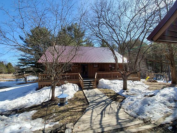 This is a great home on 2.3 acres. Includes large garage with port, extra shed, plenty of room for recreational vehicle parking. The home is unique...with open concept kitchen, dining and living area. 3 bedrooms and full bath on first floor. Second level has balcony and large 4th bedroom with eave storage. Beautiful vaulted ceilings. Pellet stove in living room heats most of the home in addition to the electric baseboard. Basement once had a coal furnace...newer ductwork is still in tact. Country living real close to all municipal amenities...includes public water!