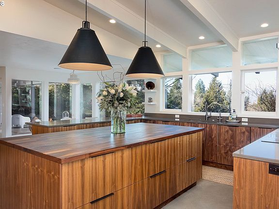 Introducing a truly exquisite example of mid-modern design coupled with style and sophistication. Re-Crafted in 2017 & situated with privacy on nearly 1/2 an acre. Entertain in style with this home's open floor plan featuring exposed beams and expansive floor to ceiling windows throughout the back of the home. They also provide lots of morning and afternoon natural lighting. Enjoy hours of radiant heat with a beautiful Tulikivi Finnish Soapstone fireplace, new natural gas fireplace and a large wood-burning fireplace. The home has also been retrofitted with an on-demand, natural gas Combi Boiler for both domestic hot water & hydronic radiant floor heat. Additionally a new 13 KW GE standby, backup generator was installed. All of these amenities help keep this home toasty warm through the coldest winters. Significant remodeling completely opened up the downstairs while preserving multiple separate spaces that create an amazing feeling of space while remaining very cozy. The chef's kitchen offers Bosch steam and convection ovens with a warming drawer, Thermador refrigerator and freezer columns, a microwave and coffee bar all built-into a freestanding appliance wall. The custom walnut kitchen cabinetry provides plenty of storage and work space. There are dual Bosch dishwashers, a Bosch induction cook top, large center island and breakfast bar. The home features Instion automation of lighting, outlets, motion sensors, door sensors, garage doors and radiant floor heat, built in Kilpsch speakers throughout, including 6.1 surround sound, Aruba Wi-Fi access points on both levels, upgraded electrical & plumbing throughout main level, a new wet bar and library nook with daybed. The massive family/bonus room offers a new natural gas fireplace with Venetian plaster surround. All of the bedrooms are located on the upper level and have a vaulted and exposed beam ceiling, large closets and access to the expansive screened in upper deck. Two of the three bathrooms have a laundry chutes. A rarity in this area, it has a flat lawn with multilevel raised garden beds, a blueberry patch, mature landscaping, hot tub, cedar deck, patio and an approximately 4,000 gallon Koi pond. The home was featured in the June/July 2017 issue of Eugene Magazine.