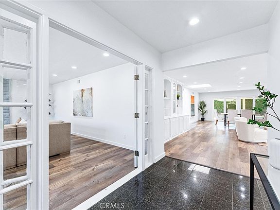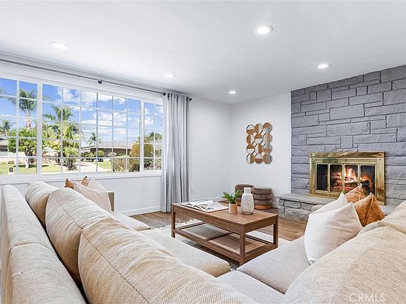 Welcome to the highly sought-out Los Coyotes Country Club community. This updated home embodies comfort and sophistication, with skylights and large windows throughout that illuminate the home with ample natural light. Upon entering the home, you are greeted by a magnificent bonus room with a luxe fireplace that would be the perfect place to entertain guests or simply relax with family and friends. The open floor plan offers a seamless flow between the kitchen, dining and living space with a view of the lush backyard and pool. A custom, built-in cabinet in the living room and discreet closets throughout the home provide generous storage space.