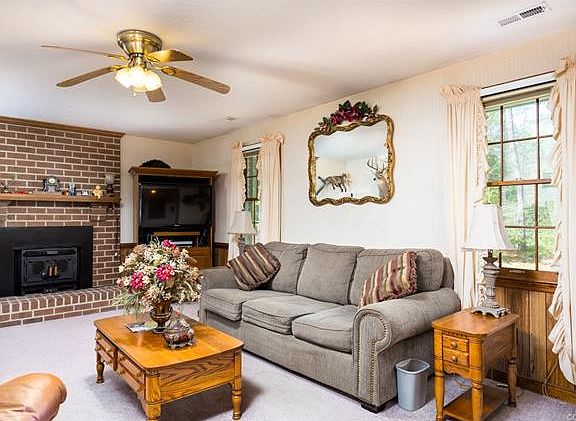 Come and see this solid Brick Rancher on 3 acres! In a peaceful countryside setting, this lovely home features 3 Bedrooms, 2 Baths, with detached two car garage and additional storage shed. New roof in 2013, large eat in Kitchen with pantry, refrigerator, washer, dryer, generous sized rooms, and Master Bedroom with private bath. Count the stars while relaxing on the deck this summer with plenty of parking for your guests! Huge wooded area behind garage with walking paths for nature lovers. Good schools, convenient to shopping, Make this home yours today! Although no known defects, Fireplace, Chimney, flue and wood stove inset convey as is. AHS Home warranty in place.