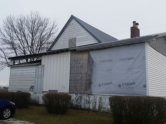 1.5 S frame house with 2 BDR. possible 3 BDR. LR with fireplace (woodburning) and eat-in Dining area. House has addition that has not been finished 20.8x14.6. Appliances remain except freezer. Full Basement with Laundry area. Large warehouse 45x95 heated with electric upstairs storage. 3 overhead doors. Slab Patio. 2A lot.