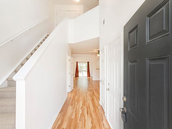 Upstairs, the primary suite is a true retreat with a large walk-in closet and an en-suite bath. Two additional bedrooms provide flexibility for a home office, guest space, or additional storage. Luxury vinyl tile flooring throughout both levels resembles stunning hardwood, providing both durability and style, while carpeted stairs add comfort and warmth. The home has been recently fully painted, giving it a fresh, modern feel. Hunter ceiling fans are installed in the living room and all bedrooms for added comfort.