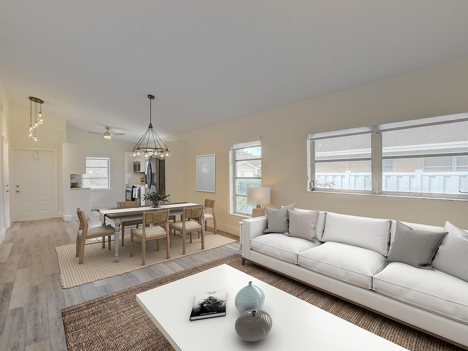 Price Improvement! Corner, UPDATED 2/2 unit w/ 1 car garage. Foyer entry into wide-open living area boasting NEW vinyl plank flooring w/ 7'' baseboards throughout! Soaring ceilings accentuate the spaciousness. Oversized LR is ready for movie night. Guests will love meals in the DA w/ pretty fixture. Entertaining is a breeze in your upgraded, gorgeous kitchen boasting SAMSUNG S/S appliances, granite counters, full glass backsplash & shaker cabinets. Fall in love in your spacious Primary Suite featuring 3 closets with build outs. NEW primary bath has vanity w/ quartz counters, & frameless shower to wash away your stress. Guest BR opens to enclosed patio. NEW guest bath has a tub to soak. Enclosed sunroom w/ AIR CONDITIONING! Big open patio for picnics. New A/C!! AMENITITES GALORE Enjoy 55+