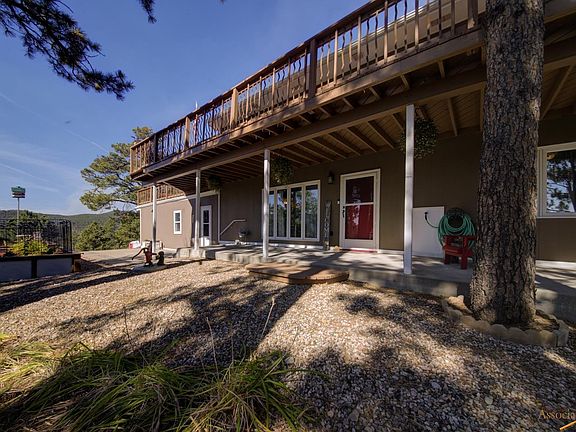 This amazing home has panoramic views of the Black Hills that will take your breath away! Situated on 2.5 acres of property in the trees, you will find a main level with a gorgeous wrap-around deck that allows for sun catching, hot-tubbing and morning coffee dates. It also brings the outside in to the large living area complete with a fireplace, open dining room and kitchen with double ovens, 2 main level bedrooms and bathroom. The lower level has a family room with an additional fireplace, a super cool wet bar room with metal surround and a half bath, 2 additional bedrooms and a completely updated bathroom. There's also an oversized 2-car garage, custom planter boxes outside, a storage shed and a concrete pad for RV parking.